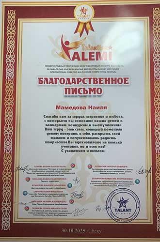 30 oktyabr 2025-ci il tarixində Üzeyir Hacıbəyli adına Bakı Musiqi Akademiyasının “Dirijorluq” kafedrasının baş müəllimi Nailə Məmmədovanın ll kurs tələbəsi Cəmil Həbibov “Talantlar aləmi” Beynəlxalq müsabiqədə 2-ci yerə layiq görülmüşdür.