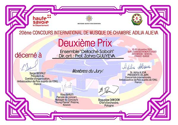 Üzeyir Hacıbəyli adına Bakı Musiqi Akademiyasının “Detache Sabah” (bədii rəhbər: Xalq artisti, professor Zəhra Quliyeva) Violinoçular ansamblı 3 tur keçərək Ədilə Əliyeva adına Beynəlxalq müsabiqənin laureatı adını qazanmışdır.
