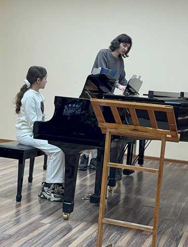 Məktəb-studiyanın fortepiano ixtisası üzrə 4-cü sinif şagirdi Mədinə Musayeva ilə dərsi III kurs tələbəsi Xəlil Mütəllibov keçdi. Hər ikisi Əməkdar müəllim, dosent Mədina Tuayevanın sinfinin nümayəndələridir. Proqramda S.Bortkeviçin H.X.Andersenin nağılı əsasında “Золотце” pyesi idi. Əsər çox obrazlı və maraqlı idi. Burada barabanda ifa edən, lakin violin ifaçısı olmaq arzusu ilə yaşayan bir uşaq haqqında söhbət gedir. Əsərdə həm zərb alətinin ritmi, həm də simlinin melodikliyi aydın şəkildə duyulurdu. Tələbə pyesi öyrənərkən hansı çətinlikləri aşmalı olduğu haqqında bəhs etdi və şagirdlə düzgün ritmi, melodiyada ifadəliliyi çatdırmaq üçün məşq etdi.