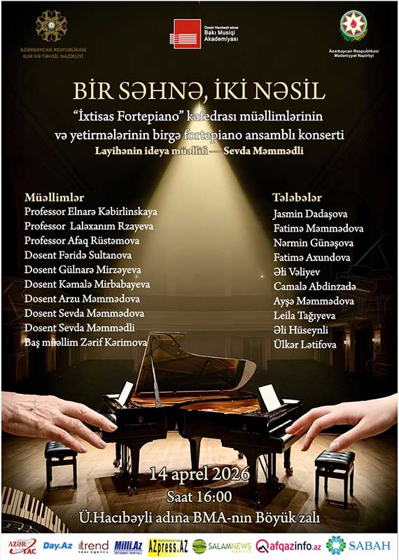 Bir səhnə, iki nəsil. "İxtisas fortepiano" kafedrası müəllimlərinin və yetirmələrinin birgə fortepiano ansamblı konserti. 14 aprel 2026-cı il. Saat: 16:00. Böyük zalı.